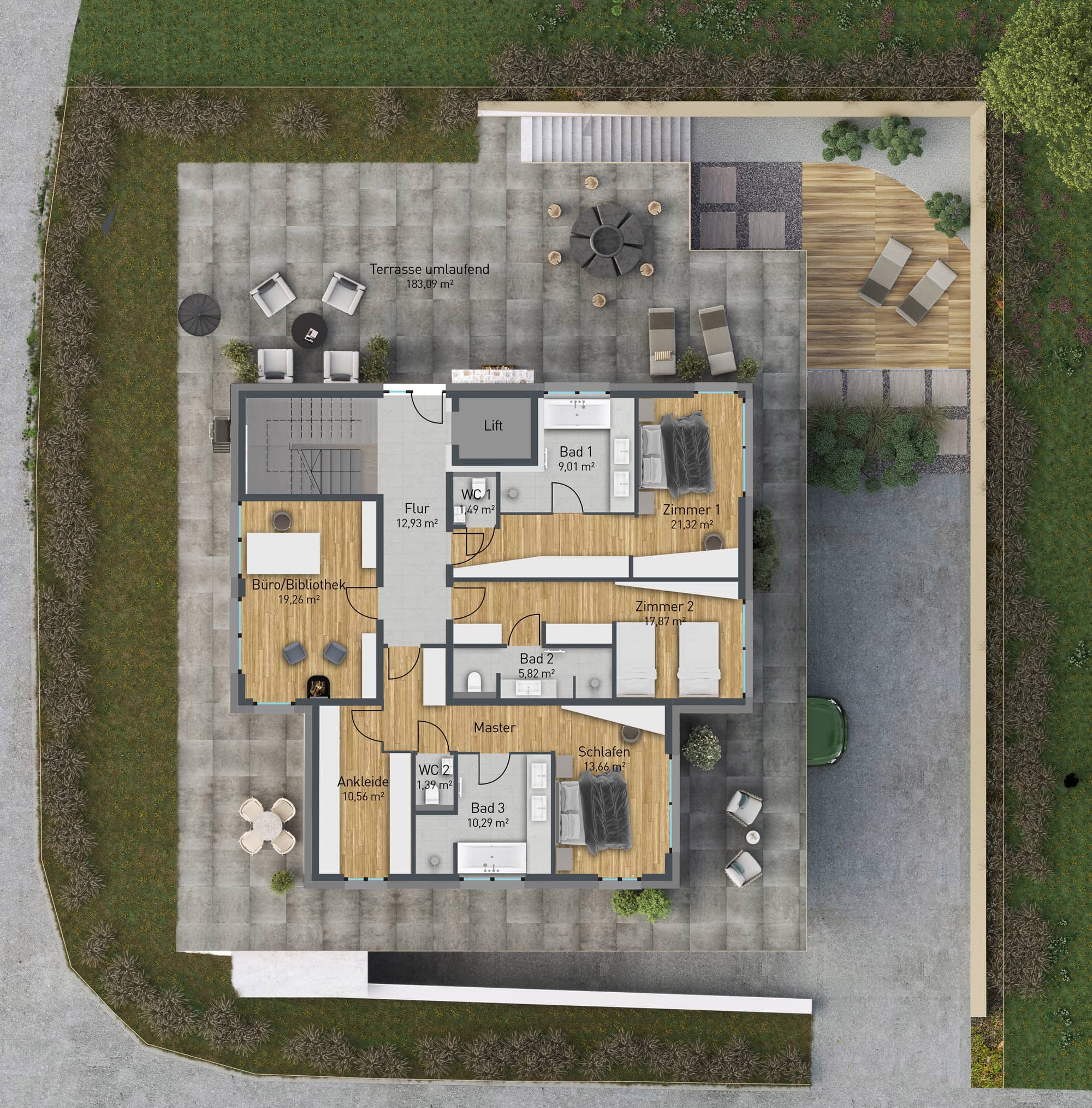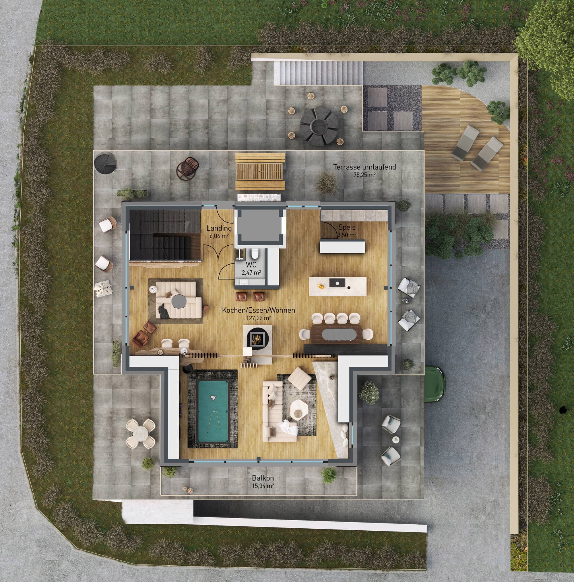 Auf Wunsch kann das Haus zudem komplett eingerichtet und stilvoll gestaltet werden – gemäß der Visualisierung.