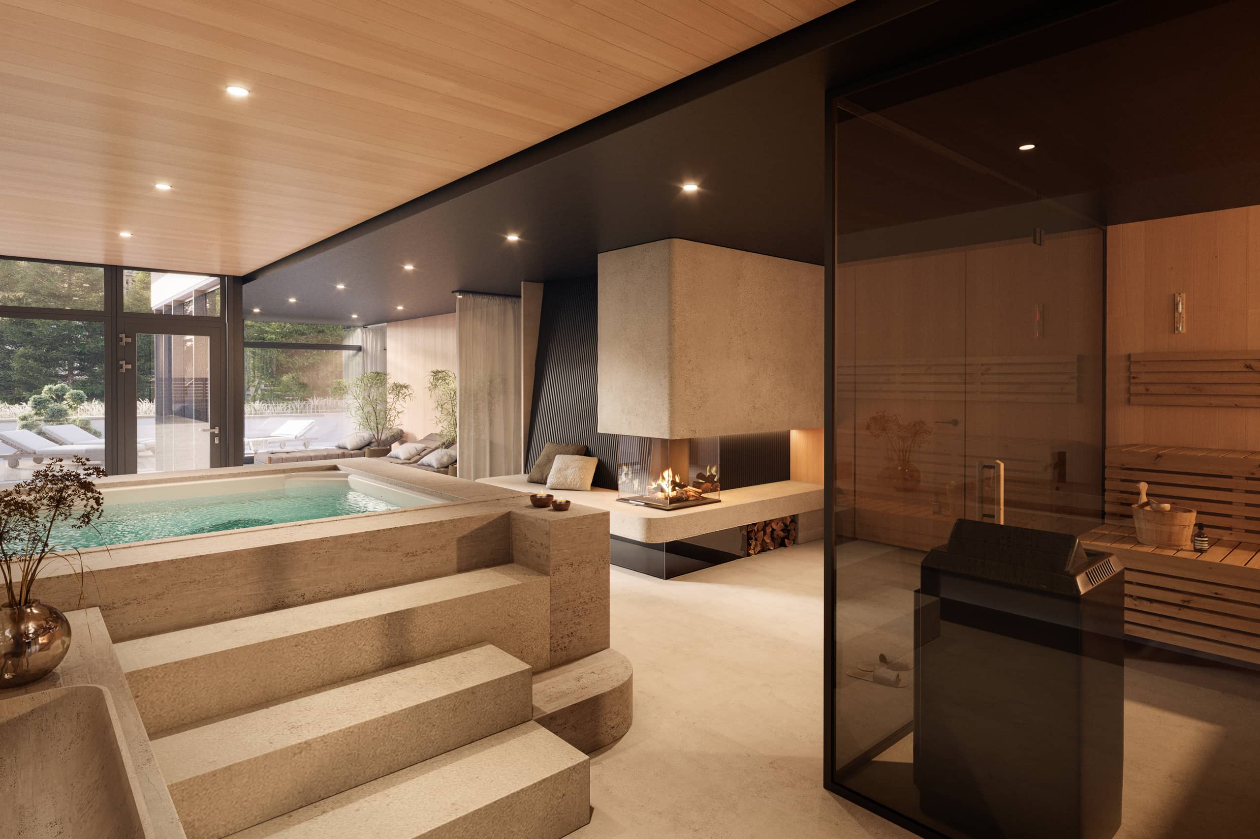 Im Gartengeschoss beginnt die Residenz mit ihrem ruhigsten Kapitel. Hier verschmilzt der private Spa mit dem Garten – Sauna, Dampfbad, Jacuzzi und Ruheraum öffnen sich zur Sonnenterrasse.